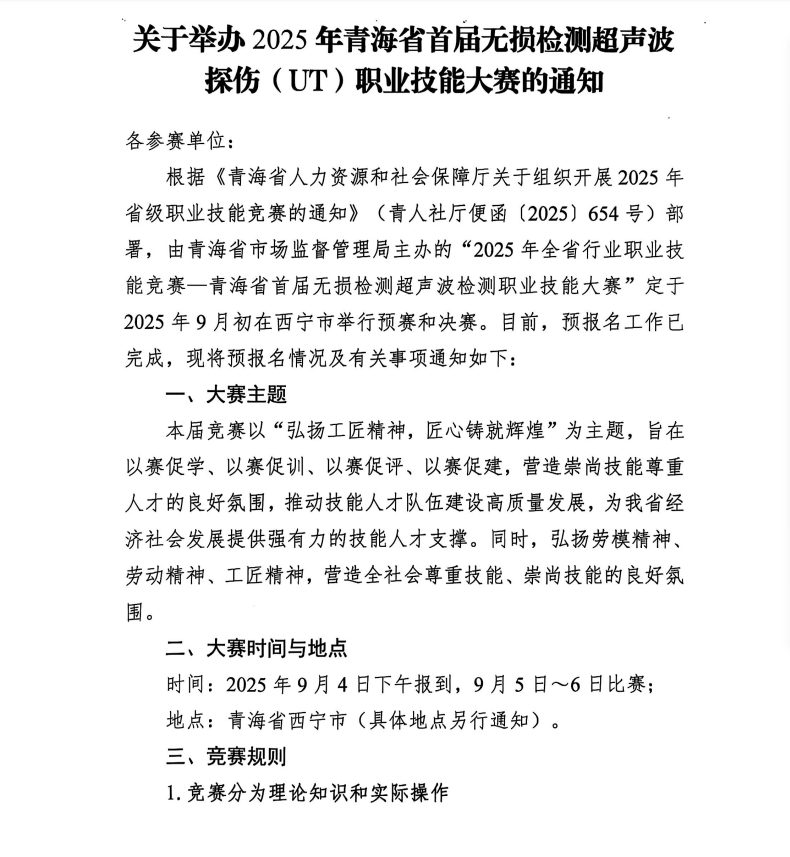 關于舉辦2025年青海省首屆無損檢測超聲波檢測探傷職業(yè)技能大賽的通知